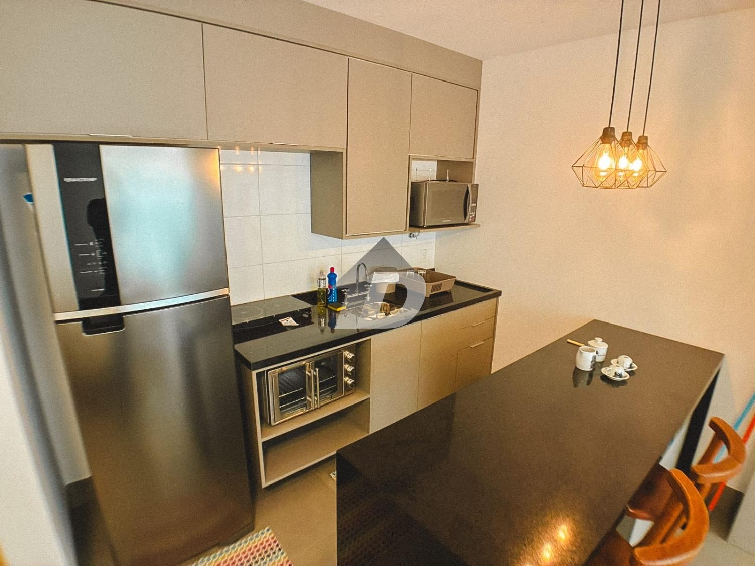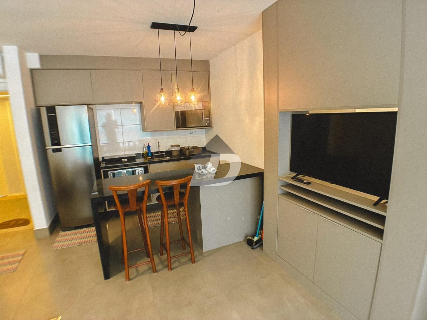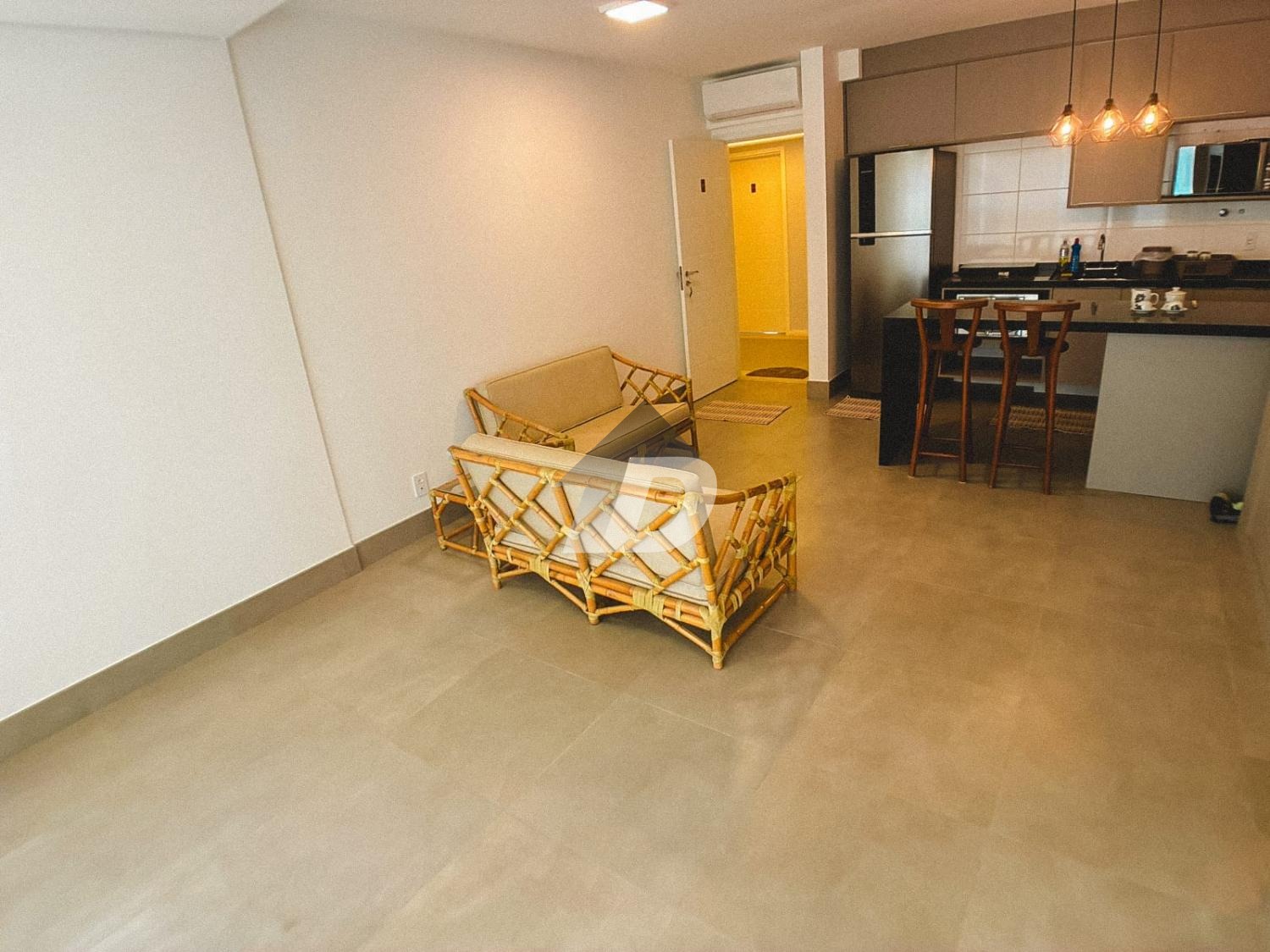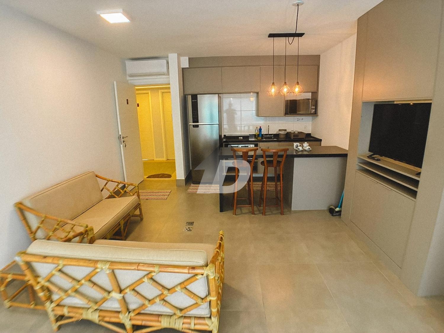 O apartamento conta com sala dois ambientes, pensada para viver, trabalhar e relaxar. Totalmente equipada, a sala oferece mesa de escritório e armários, TV, além de um layout que se adapta à rotina atual de home office e lazer. A cozinha mobiliada é um verdadeiro convite à praticidade: equipada com geladeira, fogão cooktop, micro-ondas, forno, além de armários planejados e um charmoso balcão americano com cadeiras, ideal para refeições rápidas ou momentos de convivência. O quarto mobiliado garante noites tranquilas e conforto absoluto, contando com cama, armários e ar-condicionado, proporcionando bem-estar em todas as estações do ano.