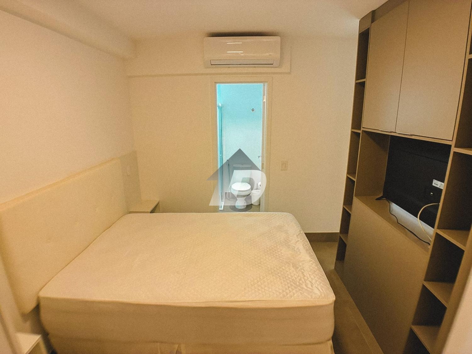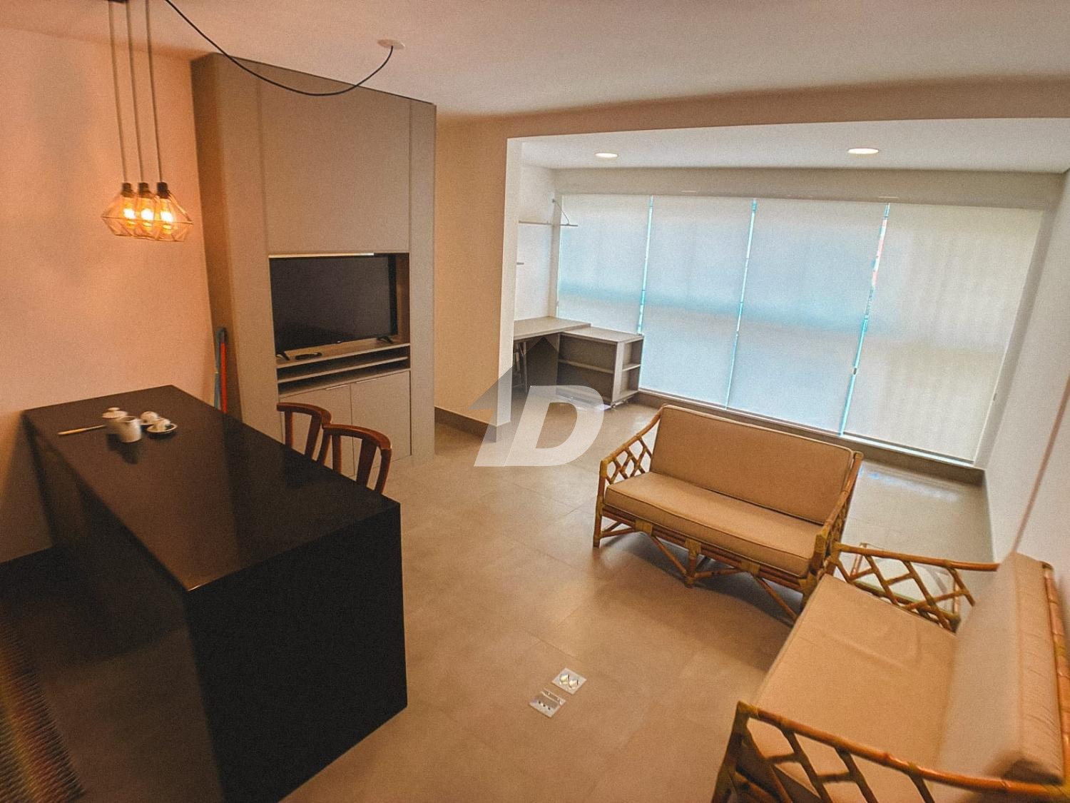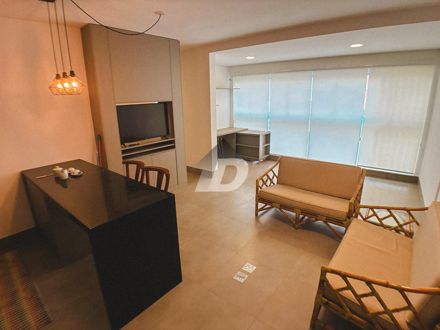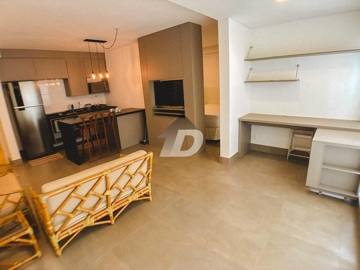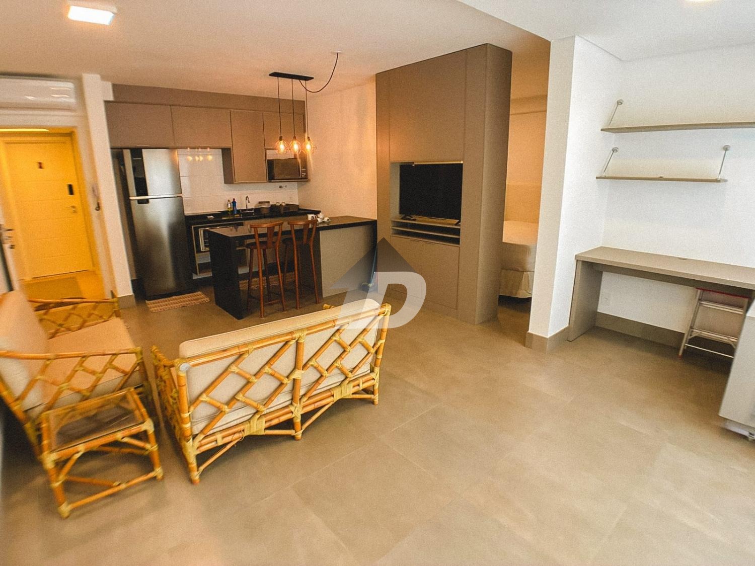 O apartamento conta com sala dois ambientes, pensada para viver, trabalhar e relaxar. Totalmente equipada, a sala oferece mesa de escritório e armários, TV, além de um layout que se adapta à rotina atual de home office e lazer. A cozinha mobiliada é um verdadeiro convite à praticidade: equipada com geladeira, fogão cooktop, micro-ondas, forno, além de armários planejados e um charmoso balcão americano com cadeiras, ideal para refeições rápidas ou momentos de convivência. O quarto mobiliado garante noites tranquilas e conforto absoluto, contando com cama, armários e ar-condicionado, proporcionando bem-estar em todas as estações do ano.
